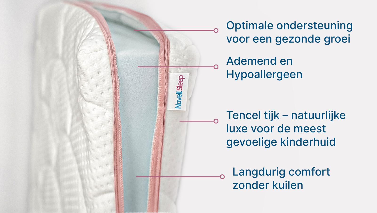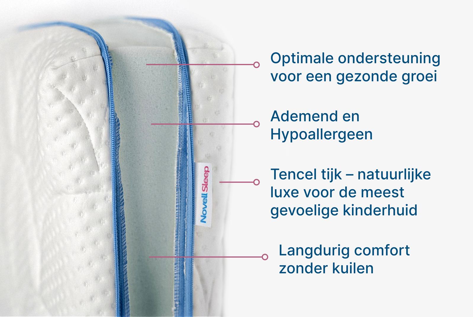 De Novell Cloud is een luxe kindermatras van speciaal ontwikkeld om jonge kinderen de best mogelijke nachtrust te bieden. Gemaakt van hoogwaardige, ademende materialen en ondersteund door wetenschappelijke studies, bevordert deze matras de slaapgezondheid en ontwikkeling van je kind. Dankzij de perfecte balans tussen comfort en ondersteuning biedt de Novell Cloud een veilige, hygiënische en rustgevende slaapomgeving.